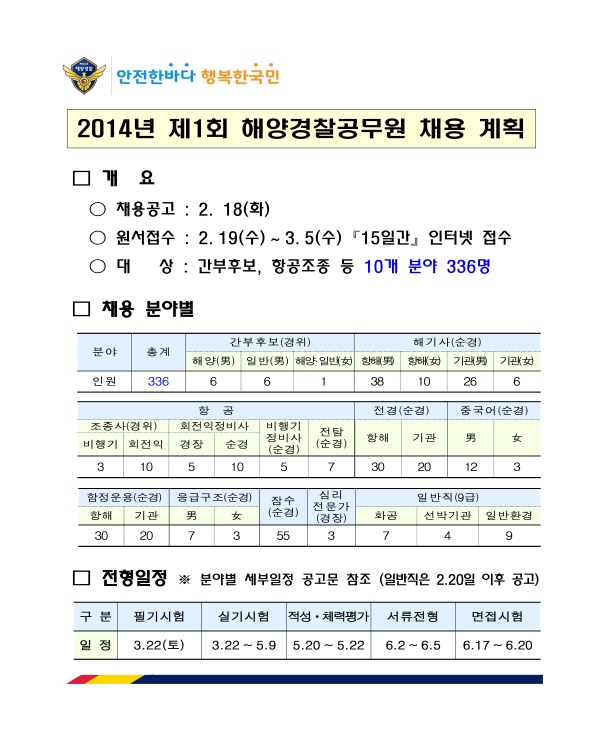 2014년도 제1회 해양경찰공무원 채용시험 계획을 붙임과 같이 공고합니다.